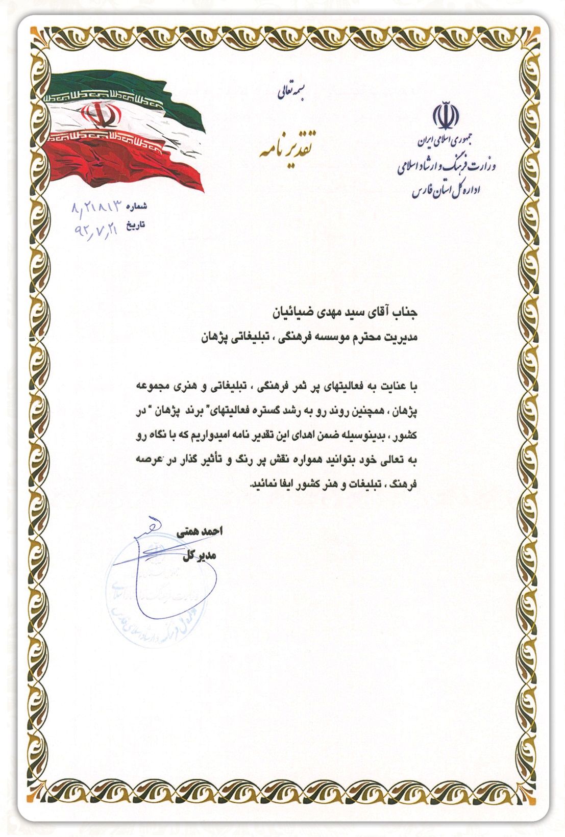 گواهینامه، تقدیرنامه گواهینامه 2015: ISO 9001 سیستم مدیریت کیفیت- سال 2015 گواهینامه 2018: ISO 10002 سیستم مدیریت رضایتمندی مشتری- سال 2018 عضویت در بنیاد اروپایی توسعه مدیریت- 1397 دریافت نشان عالی مدیریت، از دانشگاه میکی موتو - ژاپن- 1397 لوح سپاس معاون امور فرهنگی وزارت فرهنگ و ارشاد اسلامی- 1397 لوح سپاس معاون وزیر فرهنگ و ارشاد اسلامی- 1397 گواهی کارآفرینی از سازمان بین المللی کار کشورهای اسلامی - 2018 عضویت افتخاری اتاق بازرگانی و سرمایه گذاری - 1397 گواهینامه برند شایسته ملی از کنفدراسیون برند ایرانی - 1397 عضویت در انجمن کیفیت و بهره وری ایران - 1397 گواهی نامه اعتبار سنجی بین المللی از سوی کنفرانس مدیریت جهانی - 2018 1397- گواهینامه تعالی سازمانی از مر کز پژوهش و آموزش ایران گواهینامه عالی مدیریت از سوی مرکز آموزش مدیریت - 1397 21500:2012 استاندارد بین المللی مدیریت پروژه عضویت در بنیاد چهره های ماندگار - 1397 اعتبارنامه مدیر شایسته ملی - 1397 لوح سپاس دوست دار روابط عمومی - 1396 اصول و فنون مذاکرات تجاری - 1396 گواهی نامه MBA SHARK از دانشگاه Eleran Ever سوئد - سال 1395 لوح قدردانی دبیر همایش جایزه شهرت برند - سال 1395 گواهینامه 2012: ISO 10004 سنجش رضایت مشتری - سال 1395 گواهینامه 2014: ISO 10002 سیستم مدیریت رضایتمندی مشتری - سال 1395 گواهینامه 2008: ISO 9001 سیستم مدیریت کیفیت - سال 1395 گواهینامه عضویت در سازمان جهانی تبلیغات - سال 1395 تقدیرنامه اولین اجلاس نشان عالی مدیر سال - سال 1394 گواهینامه عضویت موسسه در شورای سلامت انگلستان - سال 1394 گواهینامه شرکت در چهارمین اجلاس رضایتمندی مشتری - سال 1393 تقدیر نامه اداره کل فرودگاه بین المللی قشم - سال 1393 تقدیرنامه سازمان مسکن و شهرسازی فارس - سال 1393 گواهینامه 2008: ISO 9001 سیستم مدیریت کیفیت - سال 1393 کسب عنوان نشان منتخب در همایش جهانی نشان منتخب - سال 1392 کسب عنوان حامی زمین از اجلاس جهانی حامیان زمین - سال 1392 تقدیر اداره کل فرهنگ و ارشاد اسلامی فارس از کسب عنوان برند برتر کشور - سال 1392 تقدیر اداره کل فرهنگ و ارشاد اسلامی فارس به مناسبت کسب عنوان نشان منتخب - سال 1392 تقدیر نامه اجلاس زنجیره تامین غذای سالم - سال 1392 قدردانی دبیر کل مجمع استاندارد و کیفیت اسلامی - سال 1392 قدردانی سازمان توسعه تجارت ایران - سال 1392 قدردانی شورای برگزاری یازدهمین نمایشگاه بین المللی تخصصی - سال 1392 قدردانی سازمان صنعت، معدن و تجارت تهران - سال 1392 گواهینامه شرکت در کنفرانس نام آوران صنعت و اقتصاد ایران - سال 1392 گواهینامه شرکت در اجلاس جهانی نشان منتخب - سال 1392 گواهینامه شرکت در کنفرانس بین المللی مدیریت نوین - سال 1392 گواهینامه شرکت در کنفرانس حامیان دانش و فن آوری - سال 1392 گواهینامه عضویت در اتاق بازرگانی KENT INVICTA - سال 1392 گواهینامه شرکت در دوره مدیریت نوین - سال 1392 کسب عنوان نام آوران دانش و فناوری کشور - سال 1391 تقدیرنامه شورای سیاستگذاری همایش حماسه سازان صنعت و اقتصاد ایران - سال 1391 گواهینامه شرکت در کنفرانس بین المللی "برند طلایی" - سال 1391 تقدیرنامه شورای سیاستگذاری همایش تولیدکنندگان ایرانی در مسیر بازارهای جهانی - سال 1390 قدردانی شرکت مادر تخصصی فرودگاه های کشور گواهینامه ثبت موسسه در کشور انگلستان - سال 1388 لوح افتخار از چهارمین دوره جشن فرهنگ فارس - سال 1382 لوح افتخار از سومین دوره جشن فرهنگ فارس - سال 1381 لوح افتخار از دومین دوره جشن فرهنگ فارس - سال 1380 لوح افتخار از نخستین دوره جشن فرهنگ فارس - سال 1379 گواهینامه کارشناسی عکاسی از دانشگاه برکلی