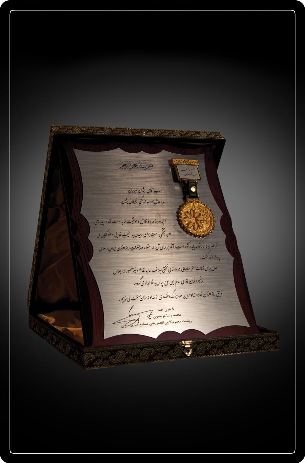 تندیس کسب مقام اول "طراحی تبلیغات محیطی" در "اولین جشنواره طراحی گرافیک تبلیغاتی فارس"- سال 1397 کسب مقام اول "طراحی تبلیغات محیطی" در "اولین جشنواره طراحی گرافیک تبلیغاتی فارس"- سال 1397 تندیس ویژه کنفرانس جهانی مدیریت کسب و کار- سال 1397 نشان طلای مدیر شایسته ملی - سال 1397 اجلاس یکصد مدیر شایسته ملی - سال 1397 هشتمین همایش و نمایشگاه شهر ایده آل - سال 1396 تندیس مشتری مداری - سال 1396 تندیس زرین حامی جشنواره ستارگان روابط عمومی ایران - سال 1396 تندیس حامی نمونه سمینار آداب میزبانی بین المللی - سال 1395 تندیس اجلاس سراسری رهبران مشتری مدار. - سال 1395 تندیس کنفرانس علمی و تخصصی مدیریت راهبردی - سال 1395 نشان عالی و لوح افتخار مدیر سال - سال 1395 تندیس همایش جایزه شهرت برند - سال 1395 تندیس همایش پیشگامان اقتصاد مقاومتی - سال 1395 نشان عالی مدیر سال - سال 1394 تندیس کیفیت و بهره وری کنفرانس ملی کیفیت - سال 1394 لوح تقدیر اجلاس سراسری مدیر شایسته ملی - سال 1394 لوح تقدیر رعایت حقوق مصرف کنندگان - سال 1394 نشان افتخار بهره وری صنعت با رویکرد اخلاق حرفه ای - سال 1393 تندیس جشنواره سرمایه گذاری سیما، سینما، صنعت و رسانه - سال 1393 تندیس ششمین همایش مقررات ملی ساختمان - سال 1393 لوح سپاس انجمن ملی حمایت از حقوق مصرف کنندگان - سال 1393 تندیس اجلاس کشوری نشان عالی مدیریت - سال 1393 تندیس اولین کنفرانس علمی استانداردهای آموزشی کشور - سال 1393 تندیس سومین اجلاس جهانی نشان منتخب - سال 1393 تندیس نشان رضایت مندی مشتری - سال 1393 تندیس اجلاس جهانی حامیان زمین - سال 1392 تندیس همایش معدن و صنایع معدنی کشور - سال 1392 نشان افتخار جشنواره مقررات ملی ساختمان - سال 1392 نشان ویژه اولین سمینار مدیریت خلاق - سال 1392 تندیس برگزیده کنفرانس مدیریت برنامه ریزی و کنترل پروژه های ساختمانی و عمرانی - سال 1392 لوح تقدیر بهترین ارائه دهنده خدمات تبلیغاتی - سال 1392 تندیس برند ویژه تبلیغاتی همایش نام آوران صنعت ساختمان - سال 1392 تندیس سومین اجلاس جهانی نشان منتخب - سال 1392 تندیس همایش تدبیر در مدیریت بهینه - سال 1392 تندیس همایش رضایتمندی مشتری - سال 1392 تندیس نشان رضایت مندی مشتری - سال 1392 تندیس کنگره ملی حماسه سازان اقتصادی - سال 1391 تندیس برگزیده همایش نام آوران دانش و فناوری کشور - سال 1391 نشان طلایی مدیران خلاق - سال 1391 تندیس برگزیده مدیر شایسته کنفرانس بین المللی MBA - سال 1391 تندیس اولین اجلاس جهانی نشان منتخب - سال 1391 تندیس اجلاس حماسه سازان صنعت و اقتصاد ایران - سال 1390 نشان طلایی اجلاس جهانی حامیان زمین - سال 1390 تندیس چهارمین کنگره سراسری پیشتازان کیفیت و کارآفرینی - سال 1390 تندیس برگزیده همایش استاندارد - سال 1390 تندیس همایش حماسه سازان عرصه کشاورزی و صنایع وابسته - سال 1389 تندیس اجلاس فناوری و ساختمان - سال 1389 لوح تقدیر شهرداری شیراز - سال 1389 تندیس برگزیده همایش یکصد مدیر برتر صنعت و تجارت ایران - سال 1389 لوح تقدیر نهمین نمایشگاه چاپ و تبلیغات - سال 1388 لوح سپاس همایش فرصت های سرمایه گذاری - سال 1388 لوح تقدیر نیروی انتظامی فارس - سال 1388 برگزیده ششمین نمایشگاه بین المللی بازار گردشگری خاورمیانه - سال 1388 تندیس نخستین همایش صنعت خودرو سازی - سال 1387 تندیس سیزدهم نمایشگاه رسانه، تبلیغات، چاپ و بسته بندی - سال 1384 تندیس برگزیده پنجمین دوره جشن فرهنگ فارس - سال 1383 تندیس برگزیده دومین دوره جشن فرهنگ فارس - سال 1380 تندیس برگزیده اولین دوره جشن فرهنگ فارس - سال 1379